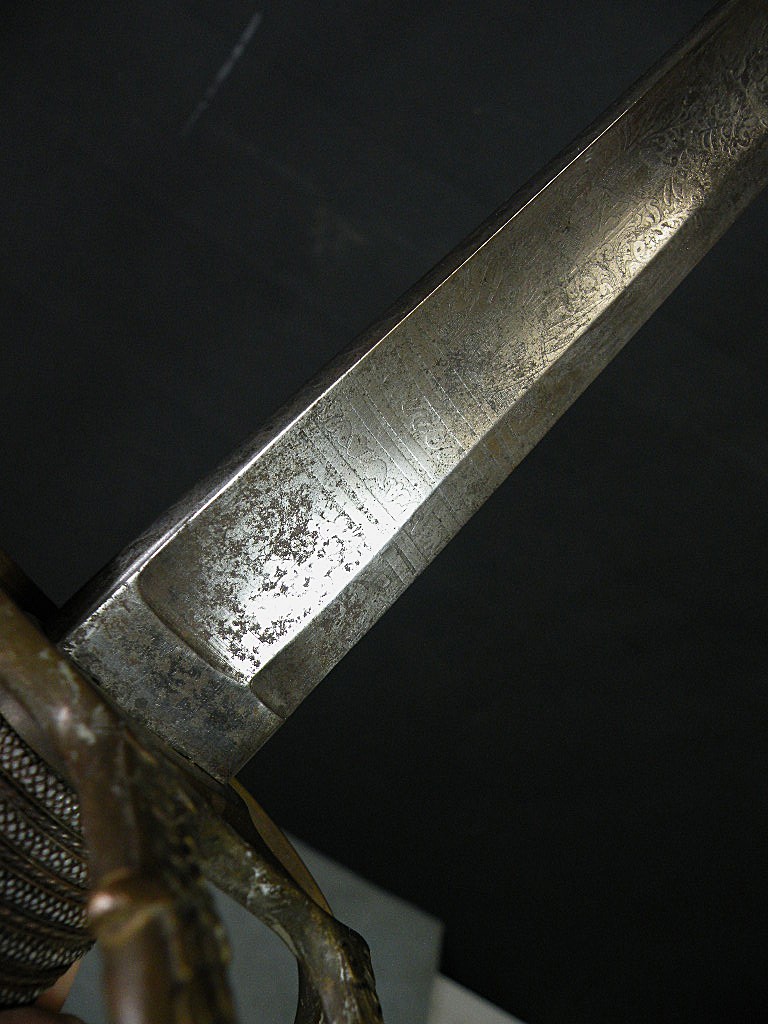 scabbard. Blade is worn and spotted with age. Nice grip.