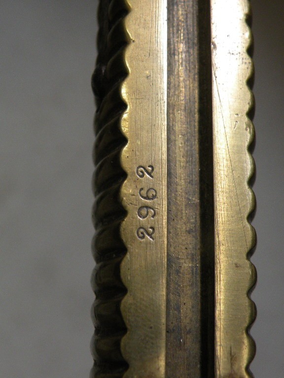 Made by Collins with original scabbard. Blade is pitted. Numbered as part of a contract of just